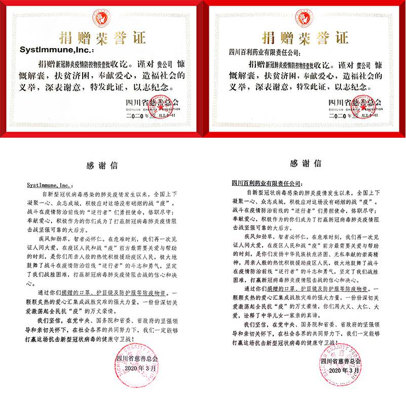 海口志睿医疗信息科技有限公司携手美国西雅图免疫,中美企业共同通过四川慈善总会,向四川和湖北等一线医院分批次捐赠医用外科口罩和N95口罩、护目镜、防护服等防护用品。向全国几十家医院捐赠抗病毒药物新博林(利巴韦林颗粒)和提高免疫的好好黄芪颗粒等,助力一线医护抗疫